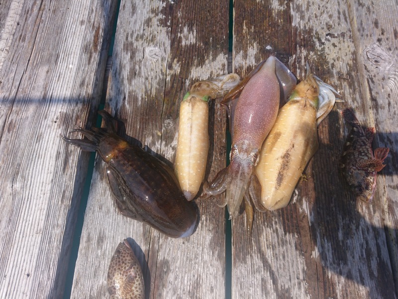 エギングで アオリイカ 600g頃に5杯 ( 写真)1杯は 共食いで 食べられた様です。