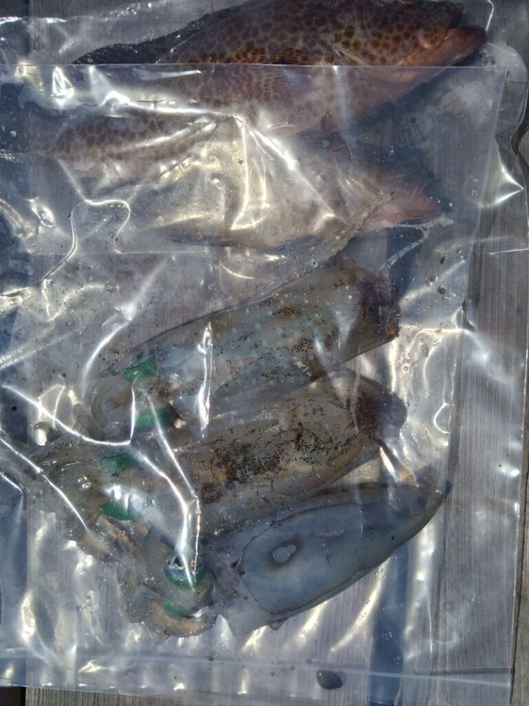 エギングで新子のアオリイカを、3杯、オオモンた2匹