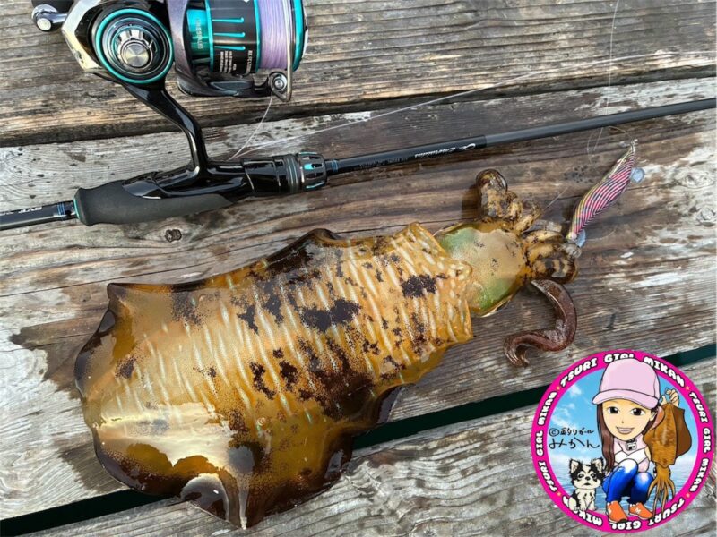 エギングで型の良いアオリイカ2杯釣れましたよ、風が強くなり早上がりです。